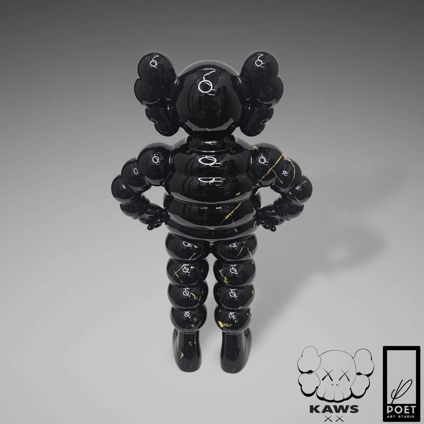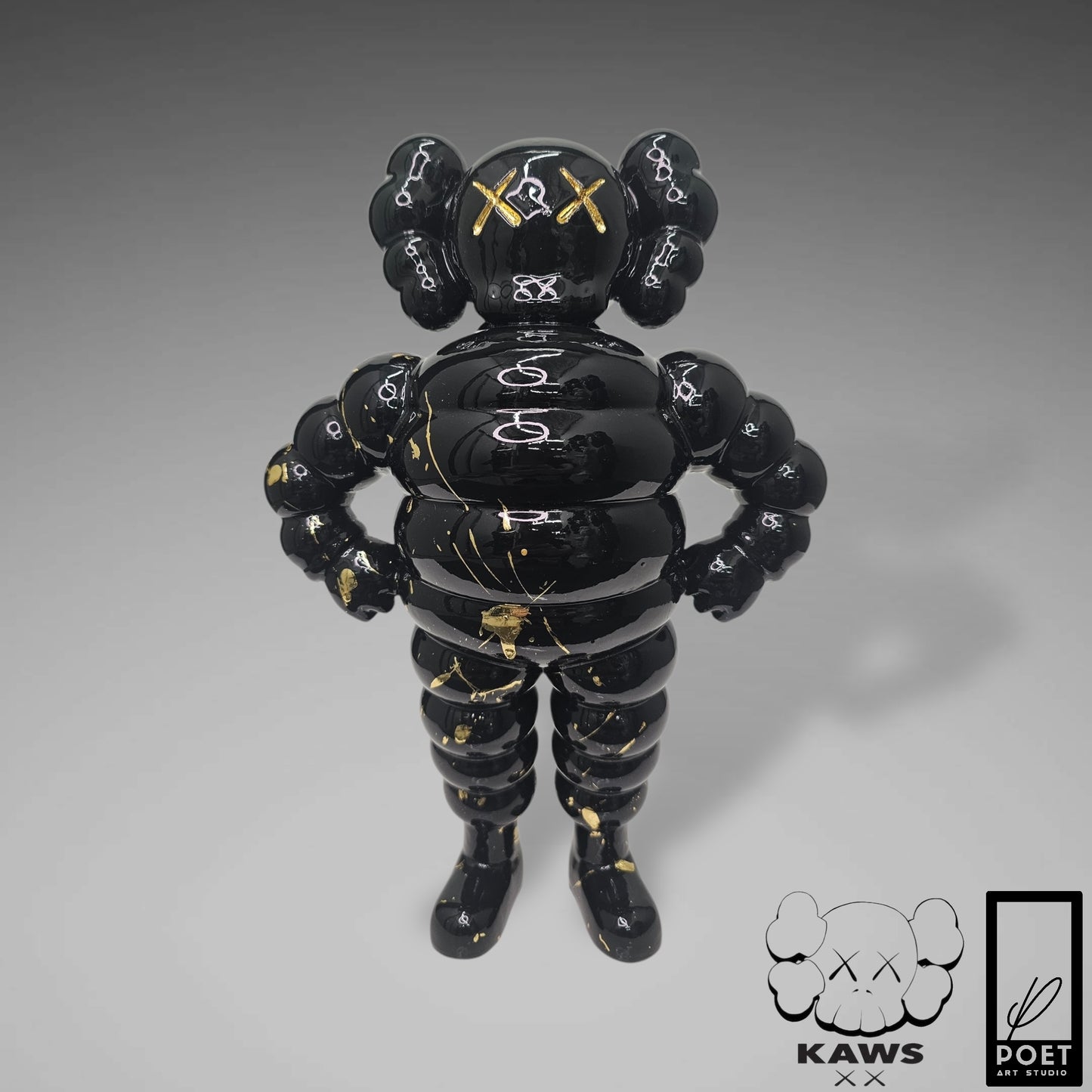 Introducing the Inspired Kaws Chum by poet. This piece features a modern black gloss base with a striking abstract gold painting. As an expert in the industry, I can confidently say this unique combination provides a sophisticated and elegant touch to any space. Don't miss out on incorporating this stunning art piece into your collection.