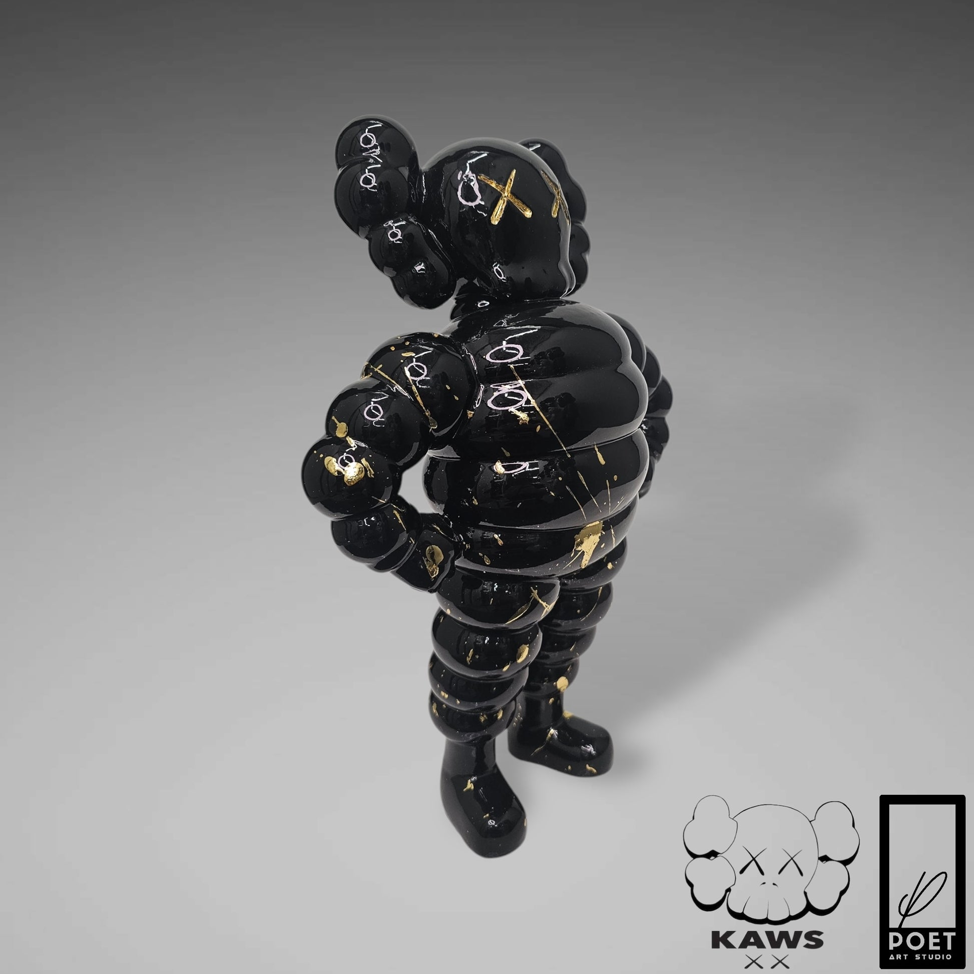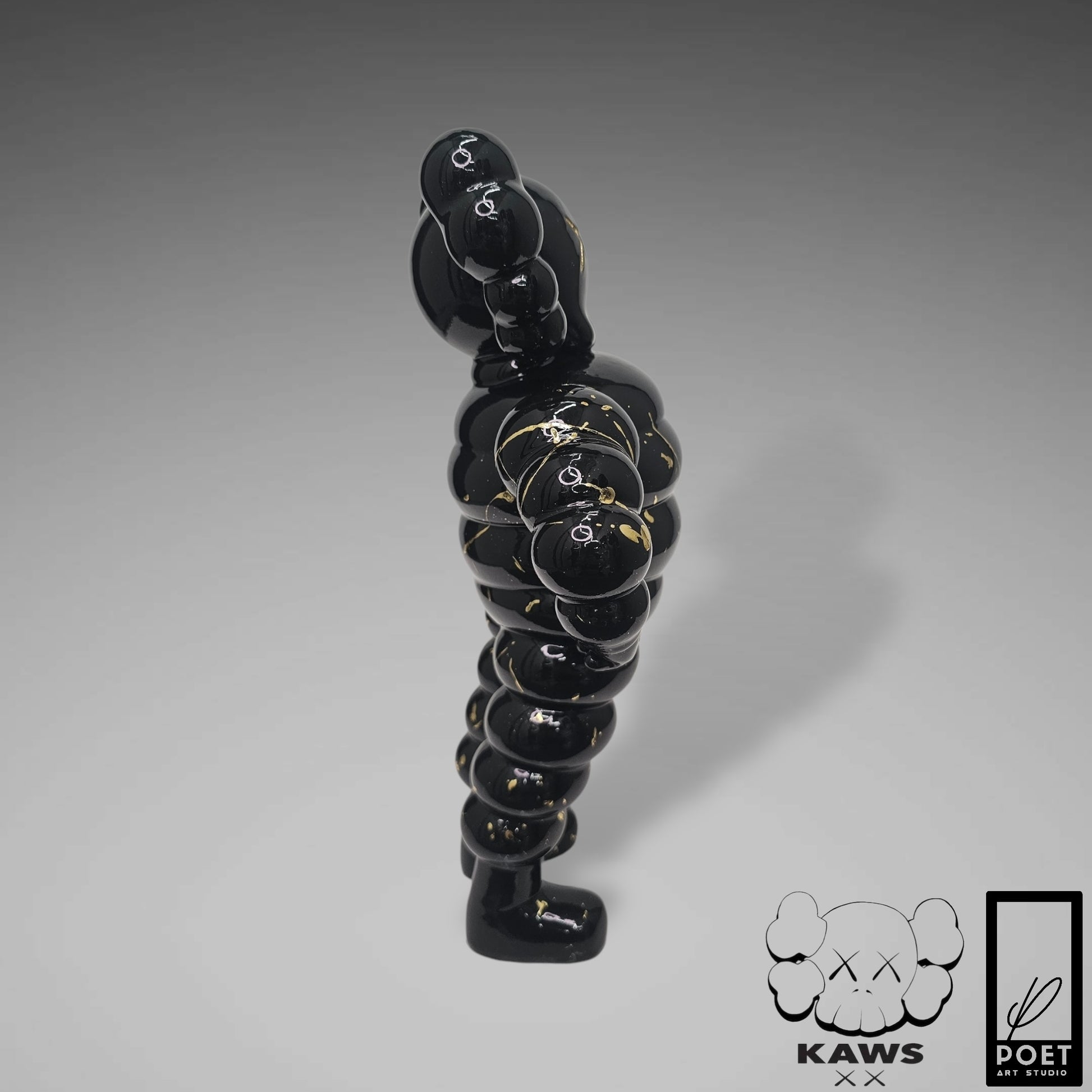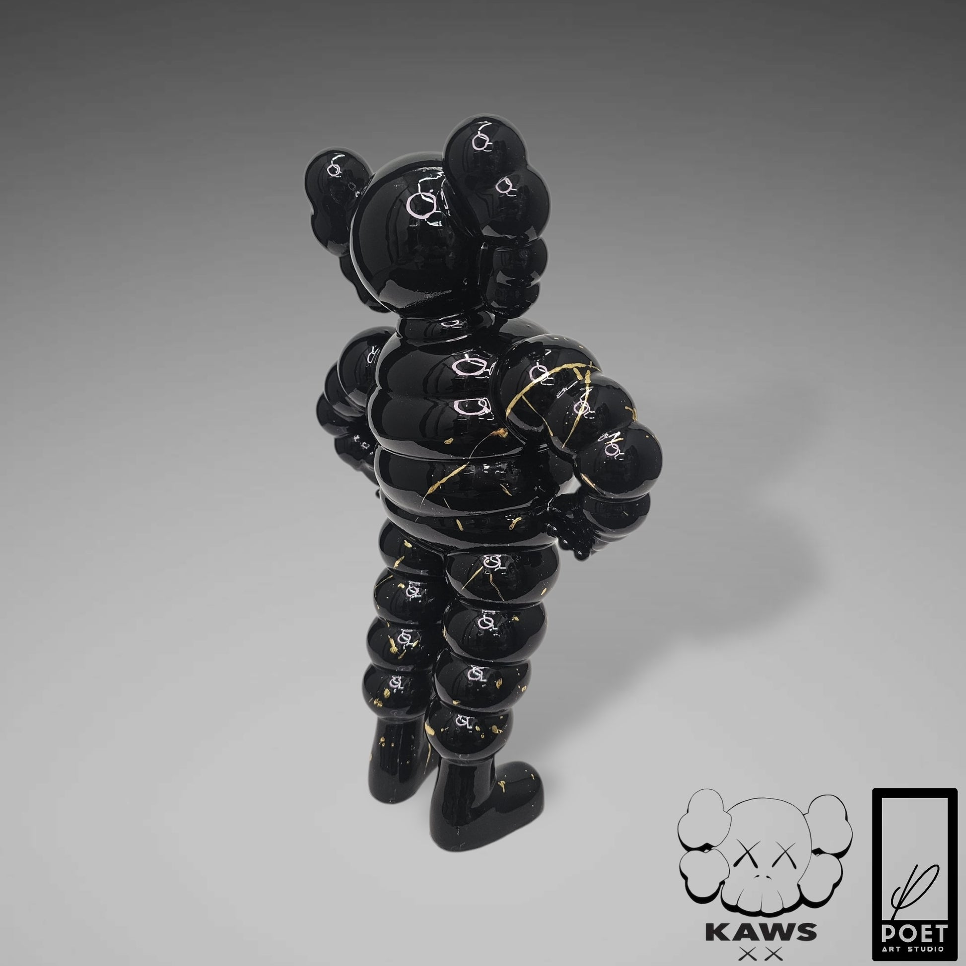Introducing the Inspired Kaws Chum by poet. This piece features a modern black gloss base with a striking abstract gold painting. As an expert in the industry, I can confidently say this unique combination provides a sophisticated and elegant touch to any space. Don't miss out on incorporating this stunning art piece into your collection.