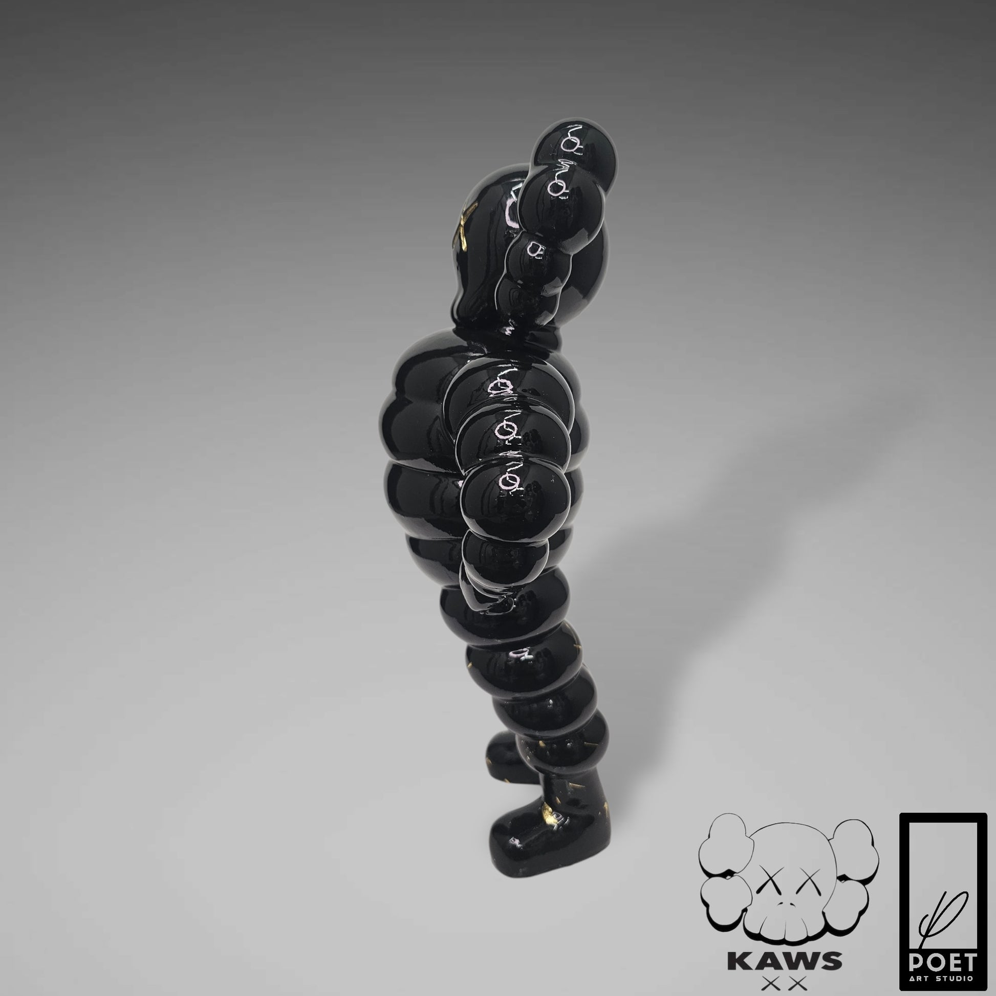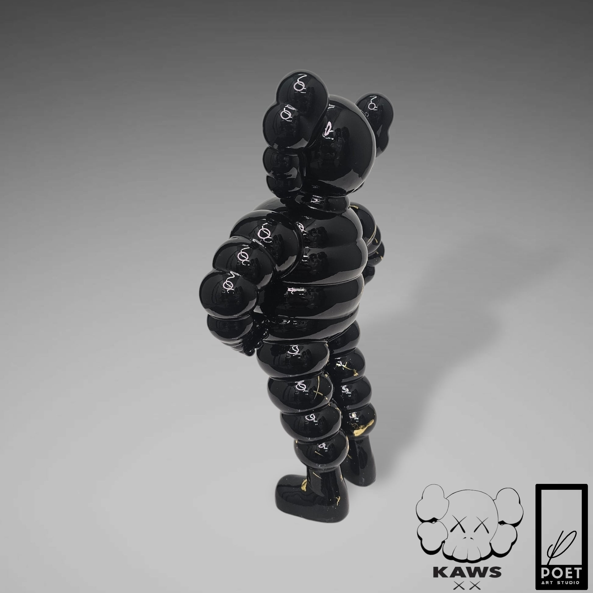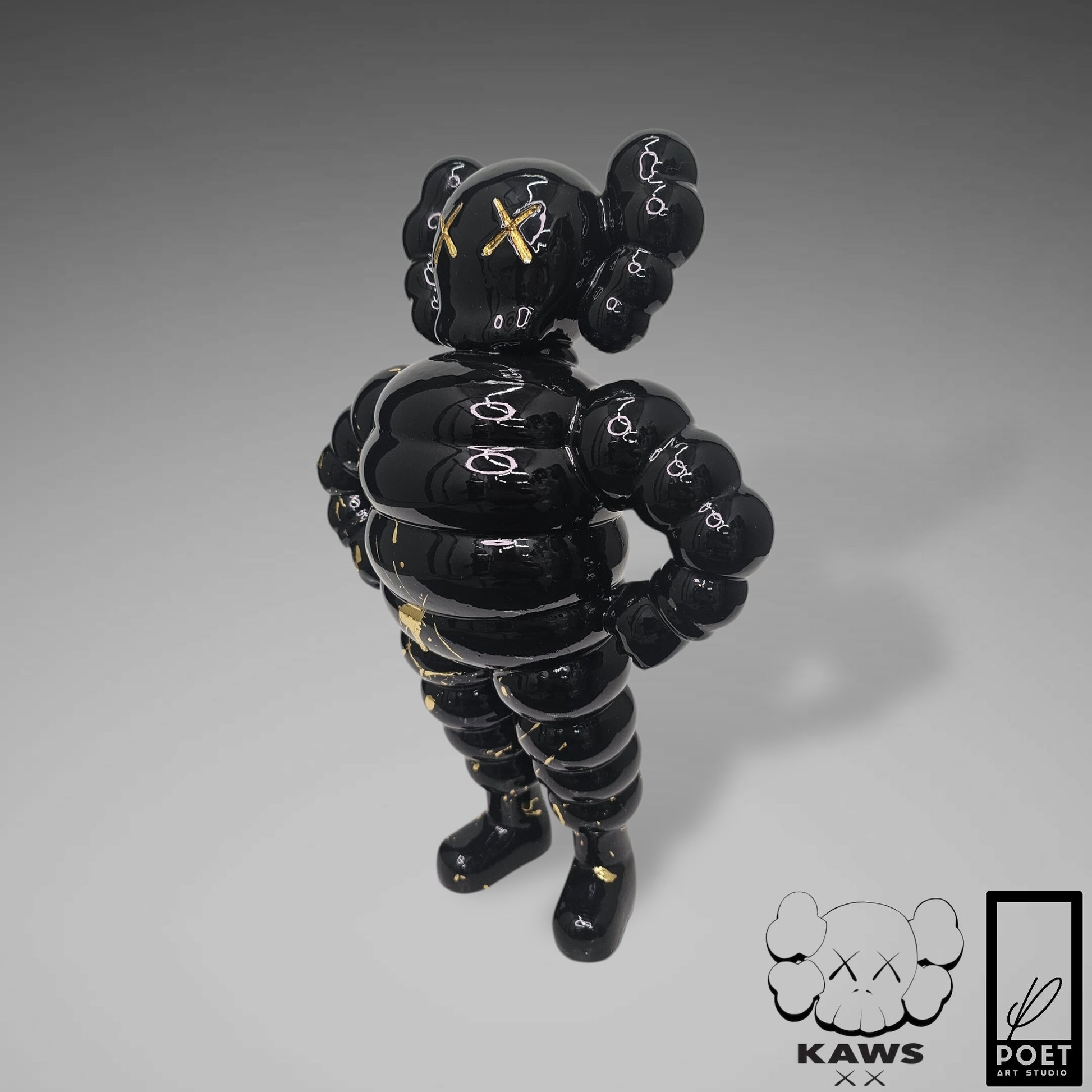 Introducing the Inspired Kaws Chum by poet. This piece features a modern black gloss base with a striking abstract gold painting. As an expert in the industry, I can confidently say this unique combination provides a sophisticated and elegant touch to any space. Don't miss out on incorporating this stunning art piece into your collection.