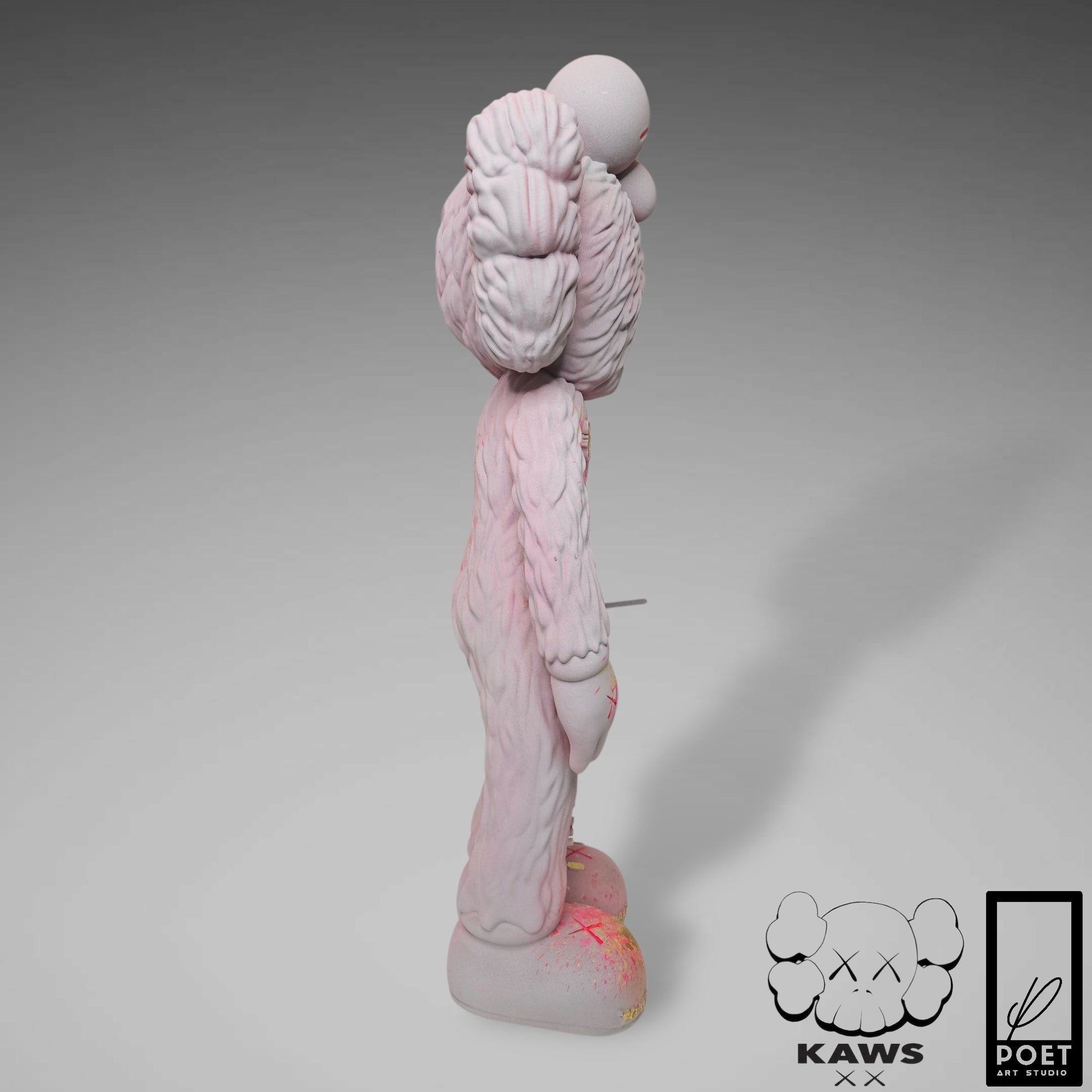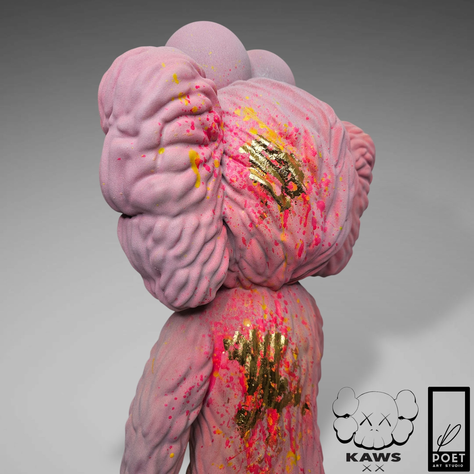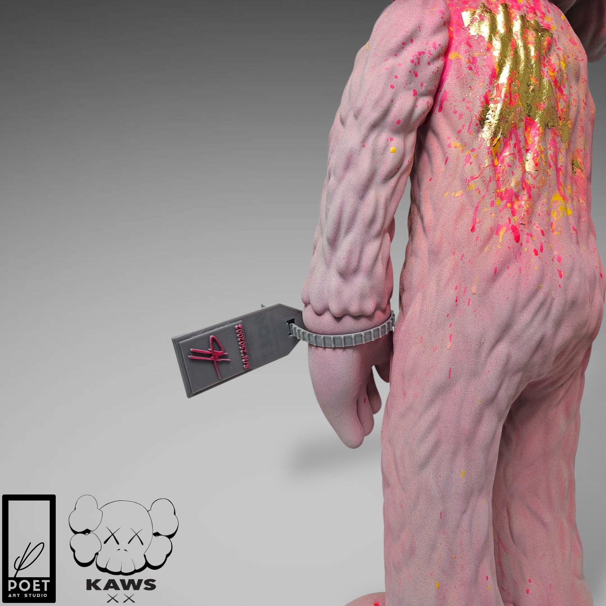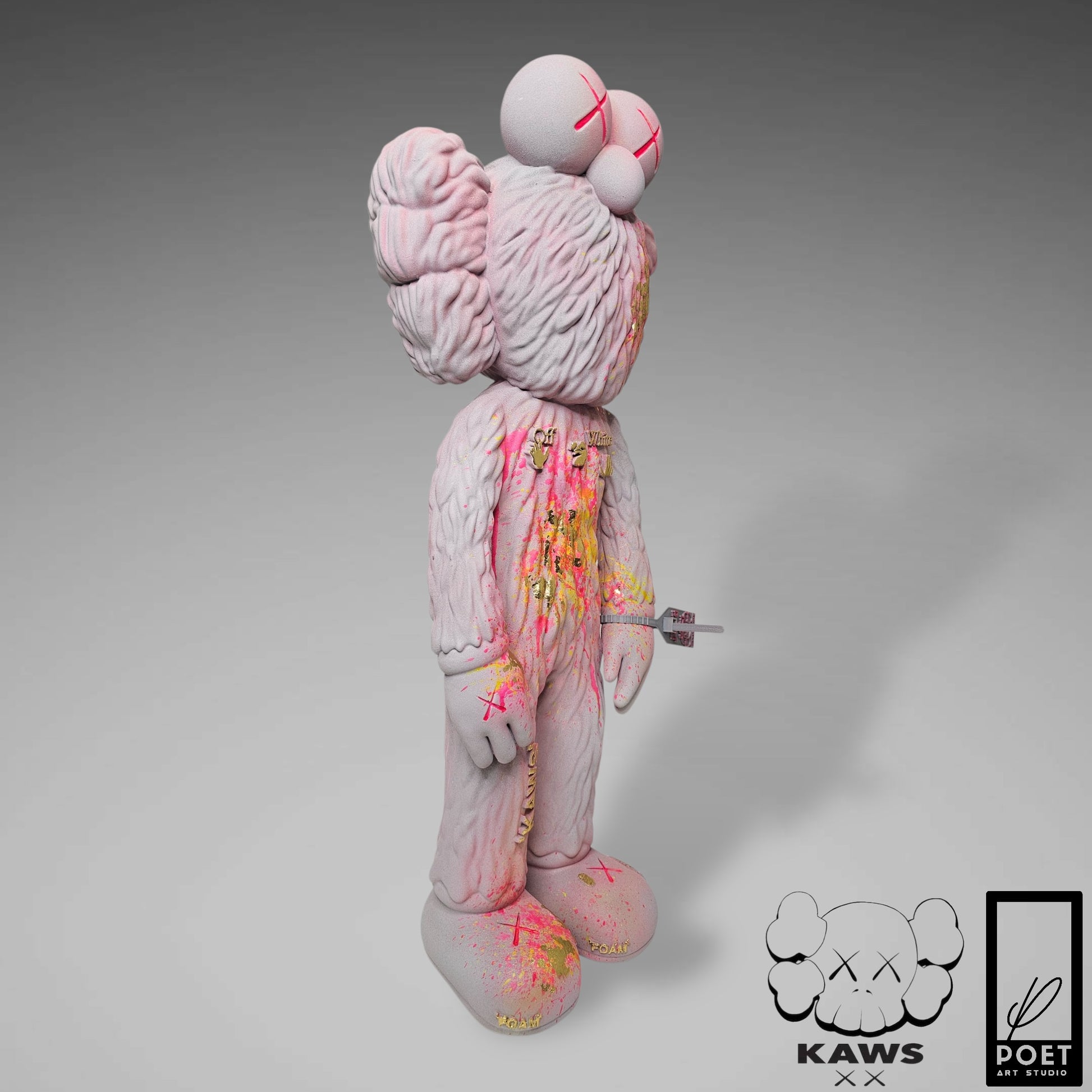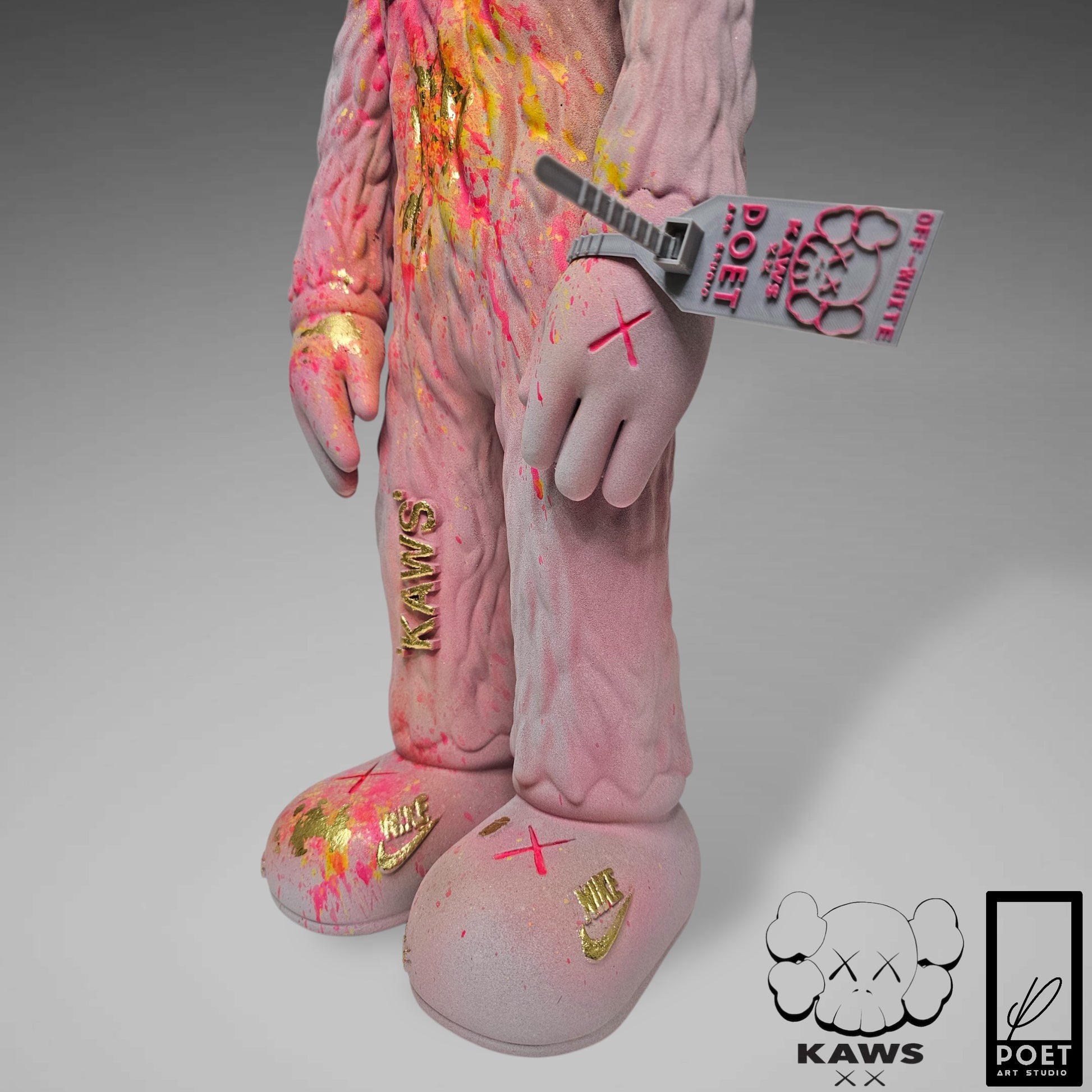 Experience the ultimate collaboration between Kaws and Off-White, featuring stunning street art on a concrete base with neon accents and a touch of gold. Elevate your urban aesthetic with this limited edition masterpiece.