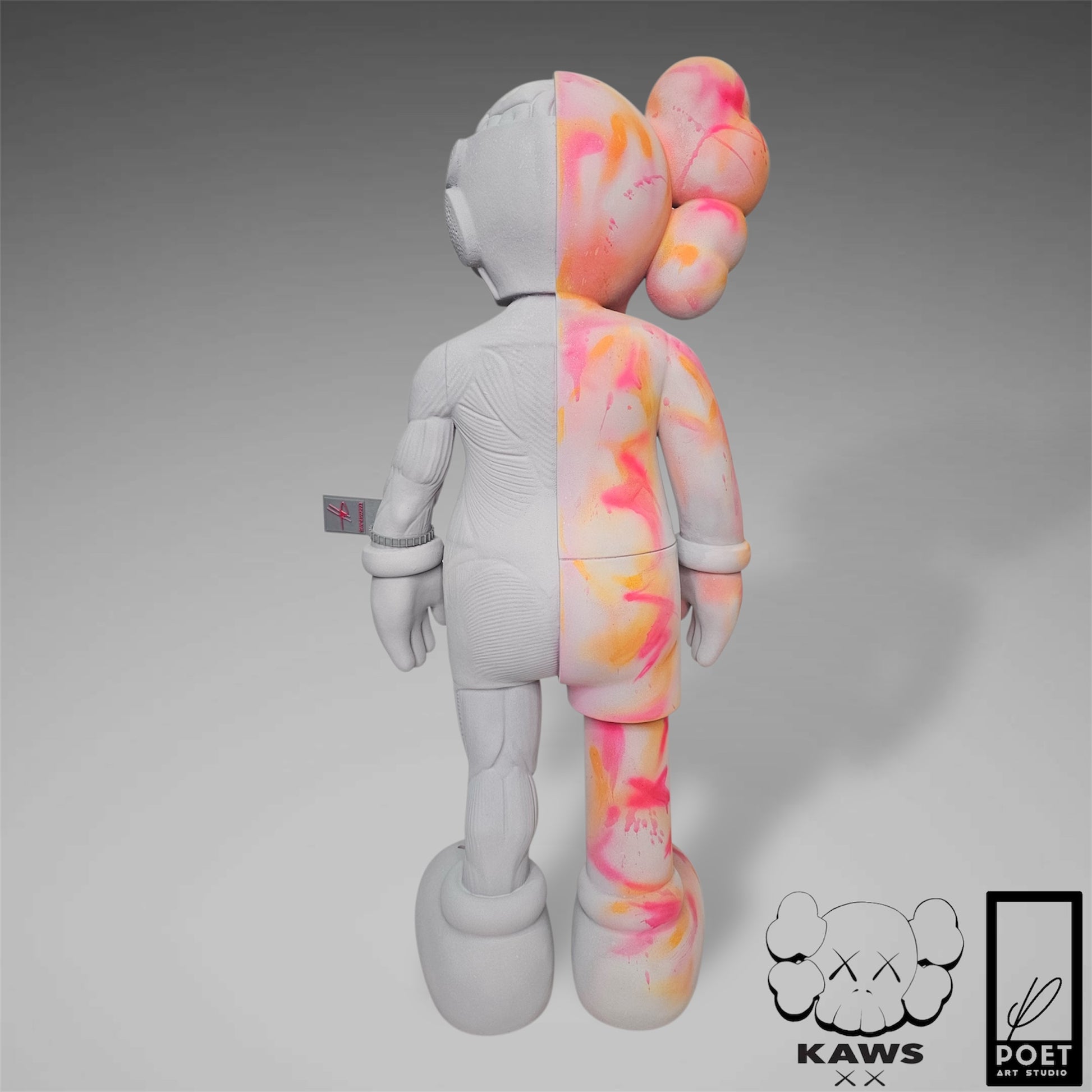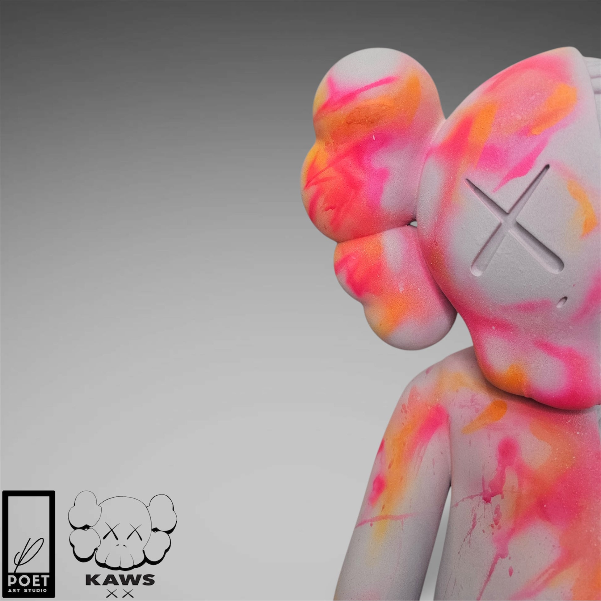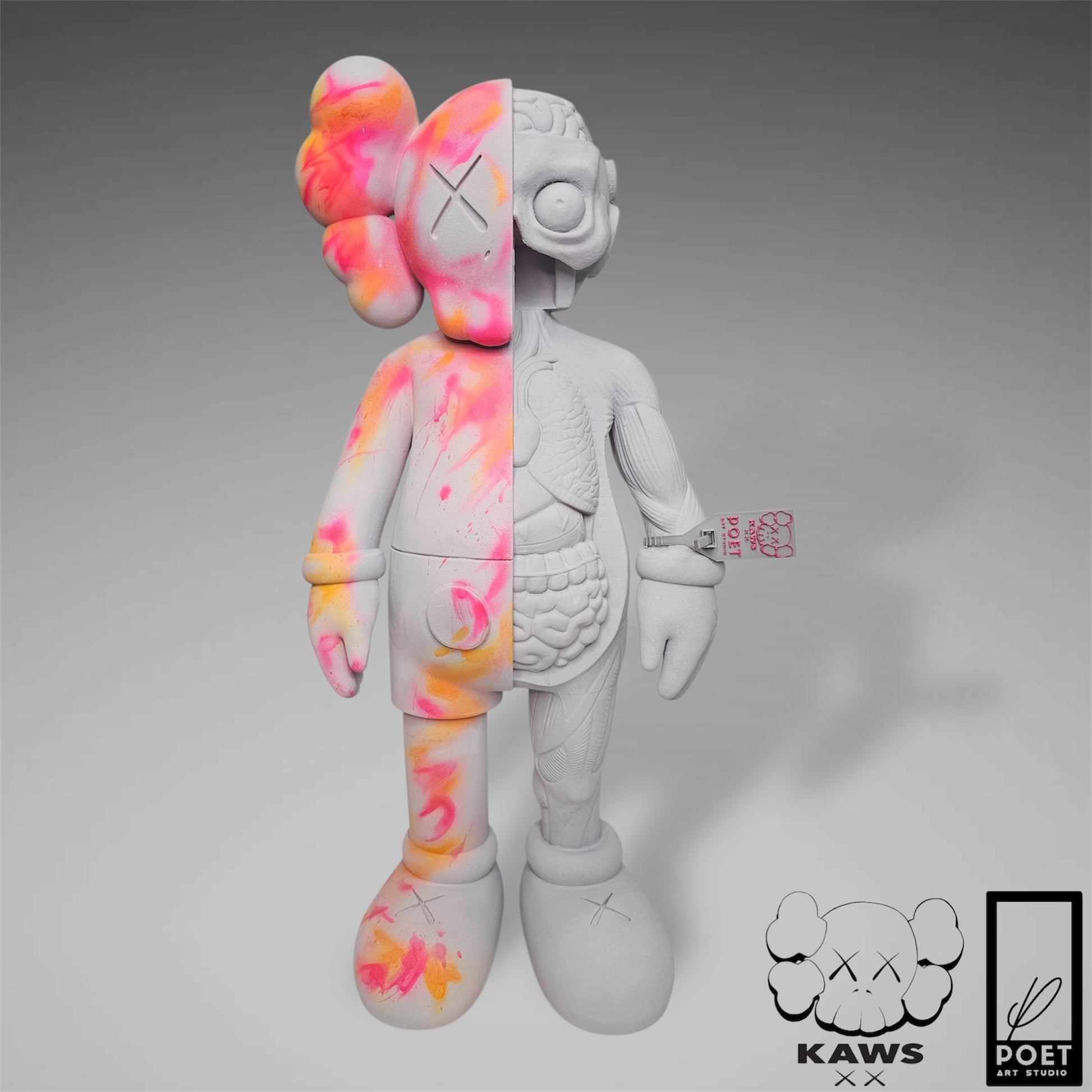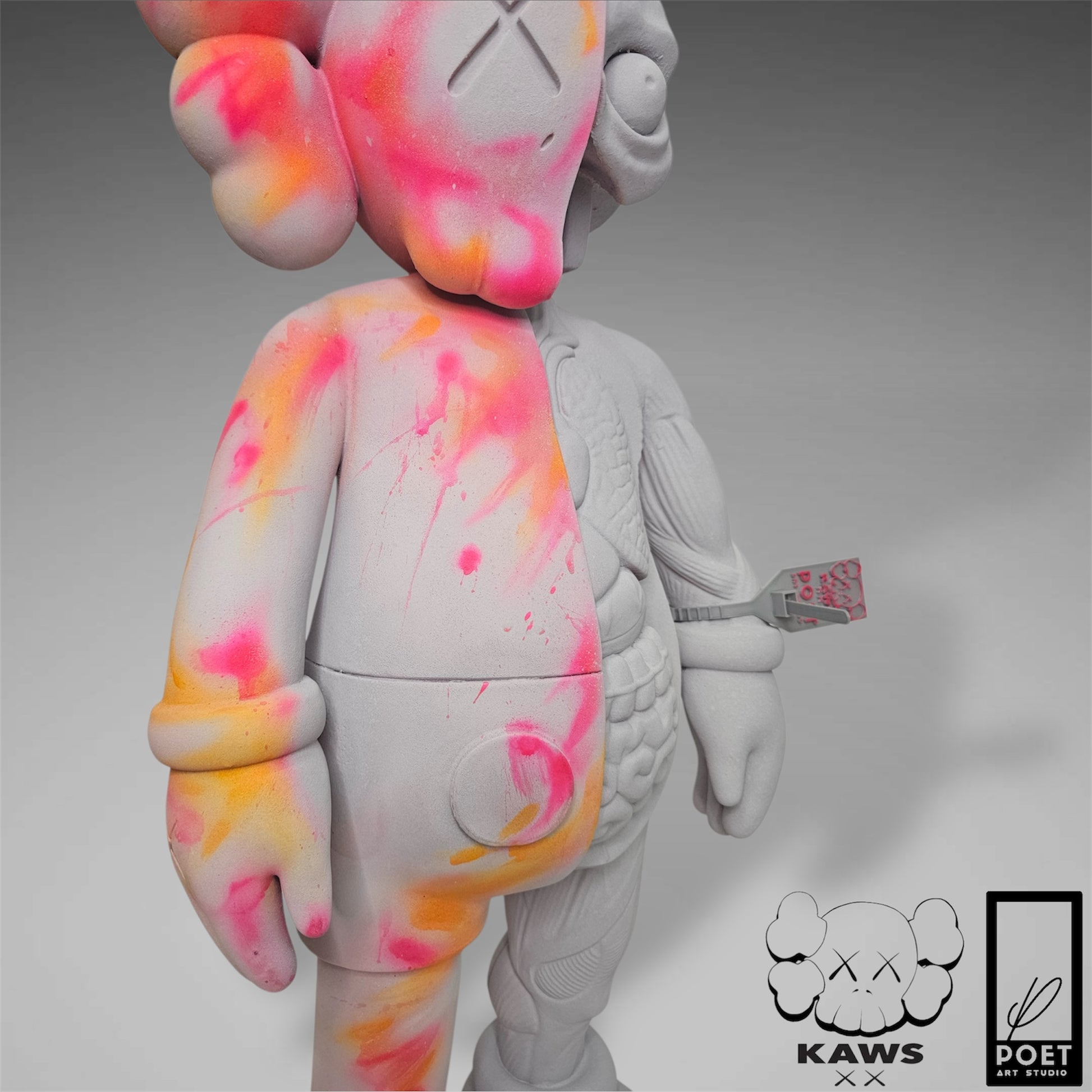 Experience the bold energy of Kaws with this abstract street art piece, featuring a light grey concrete base and vibrant neon accents. Add a touch of urban edge to any space with this inspired kaws flayed open design by Poet.