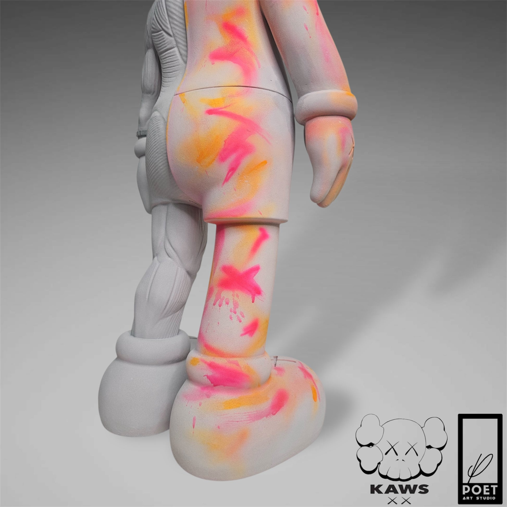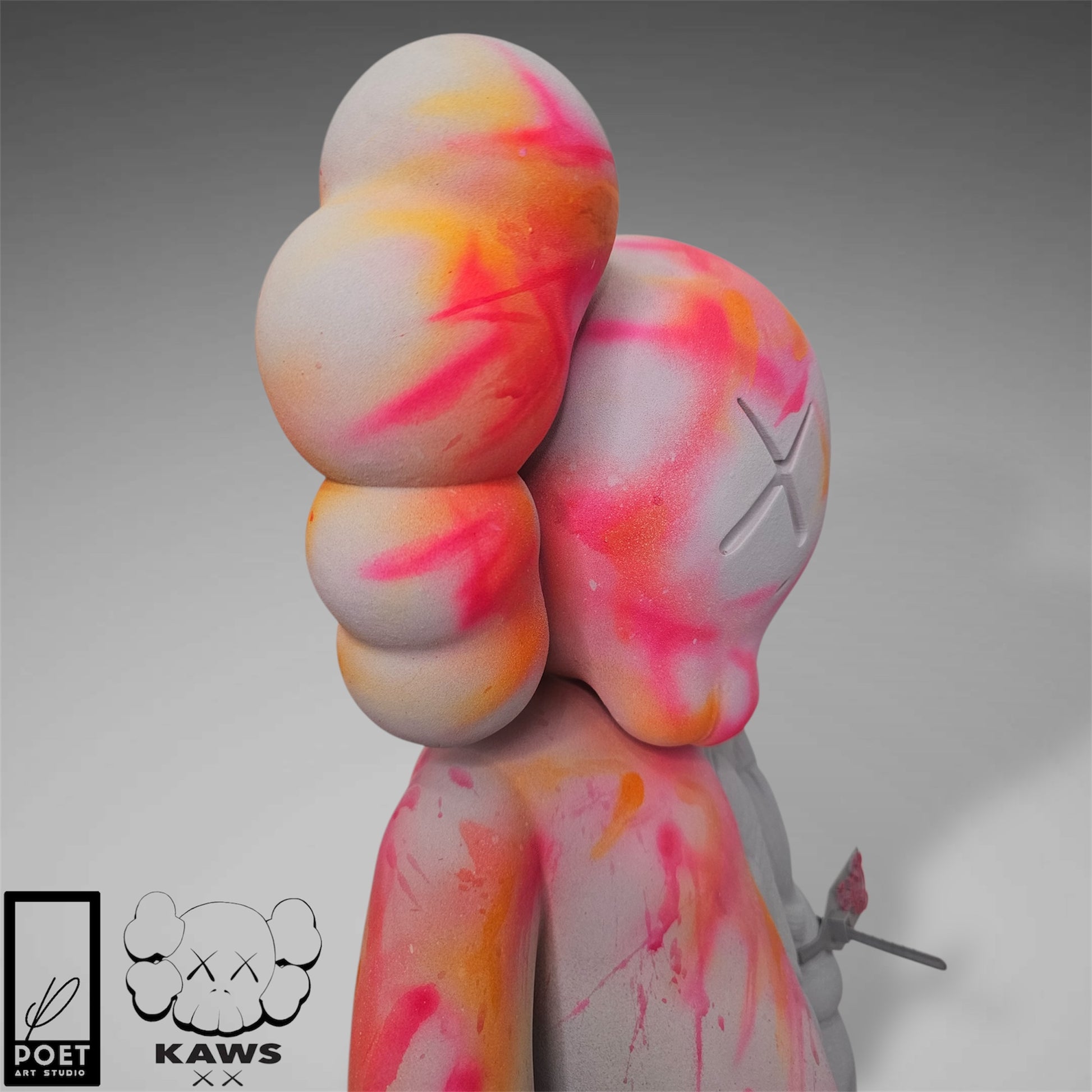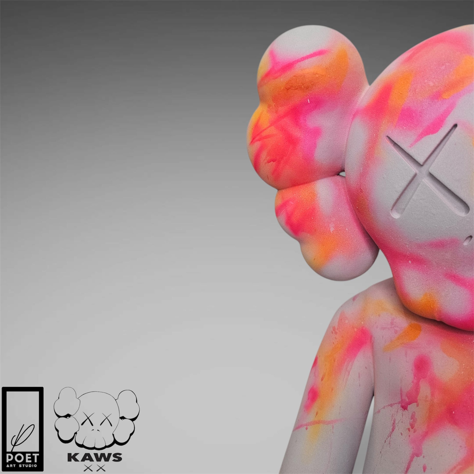 Experience the bold energy of Kaws with this abstract street art piece, featuring a light grey concrete base and vibrant neon accents. Add a touch of urban edge to any space with this inspired kaws flayed open design by Poet.
