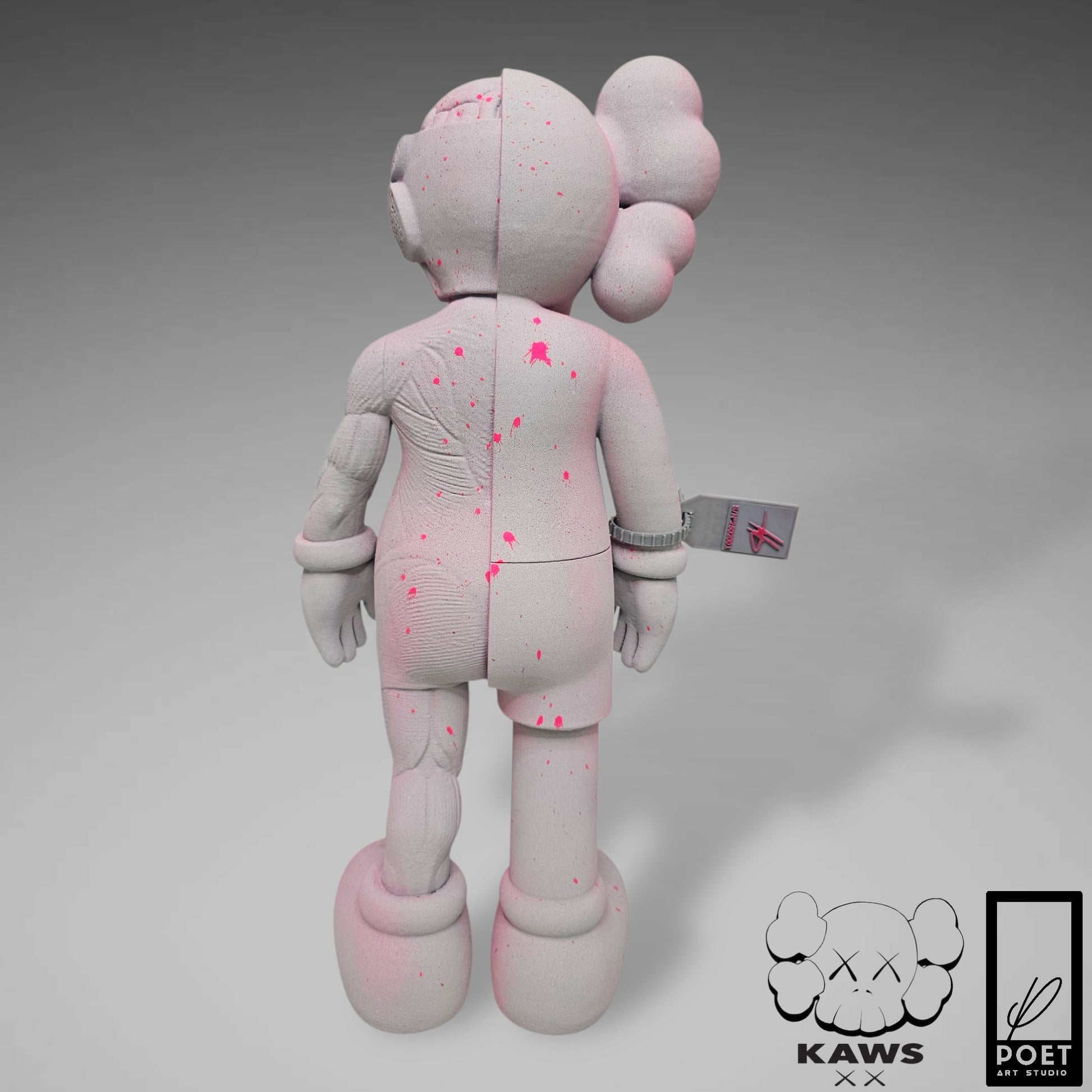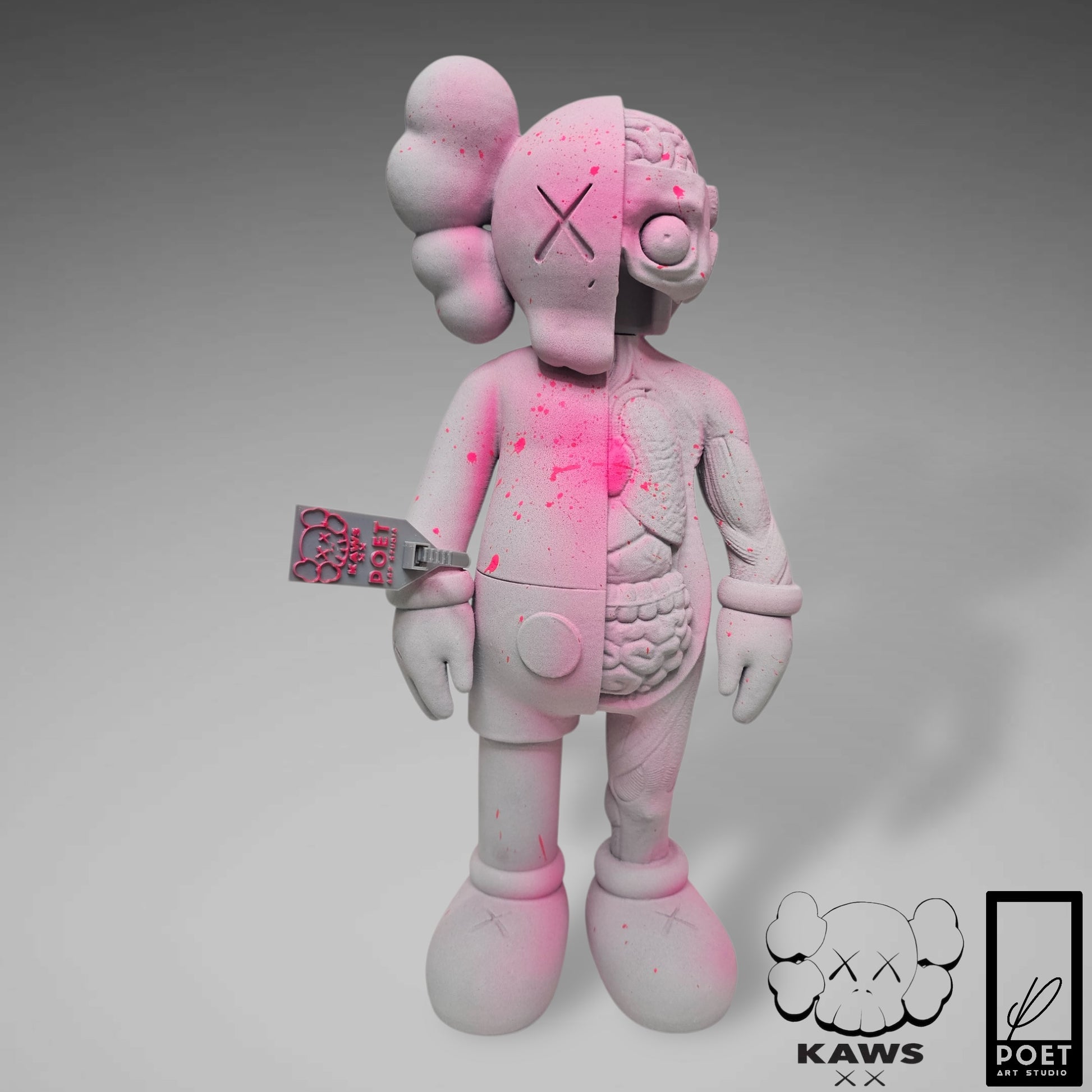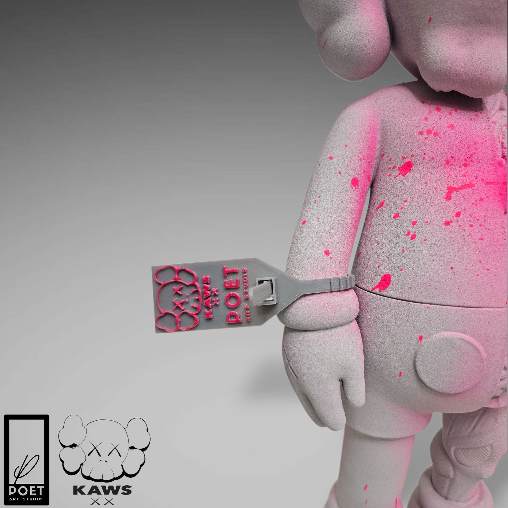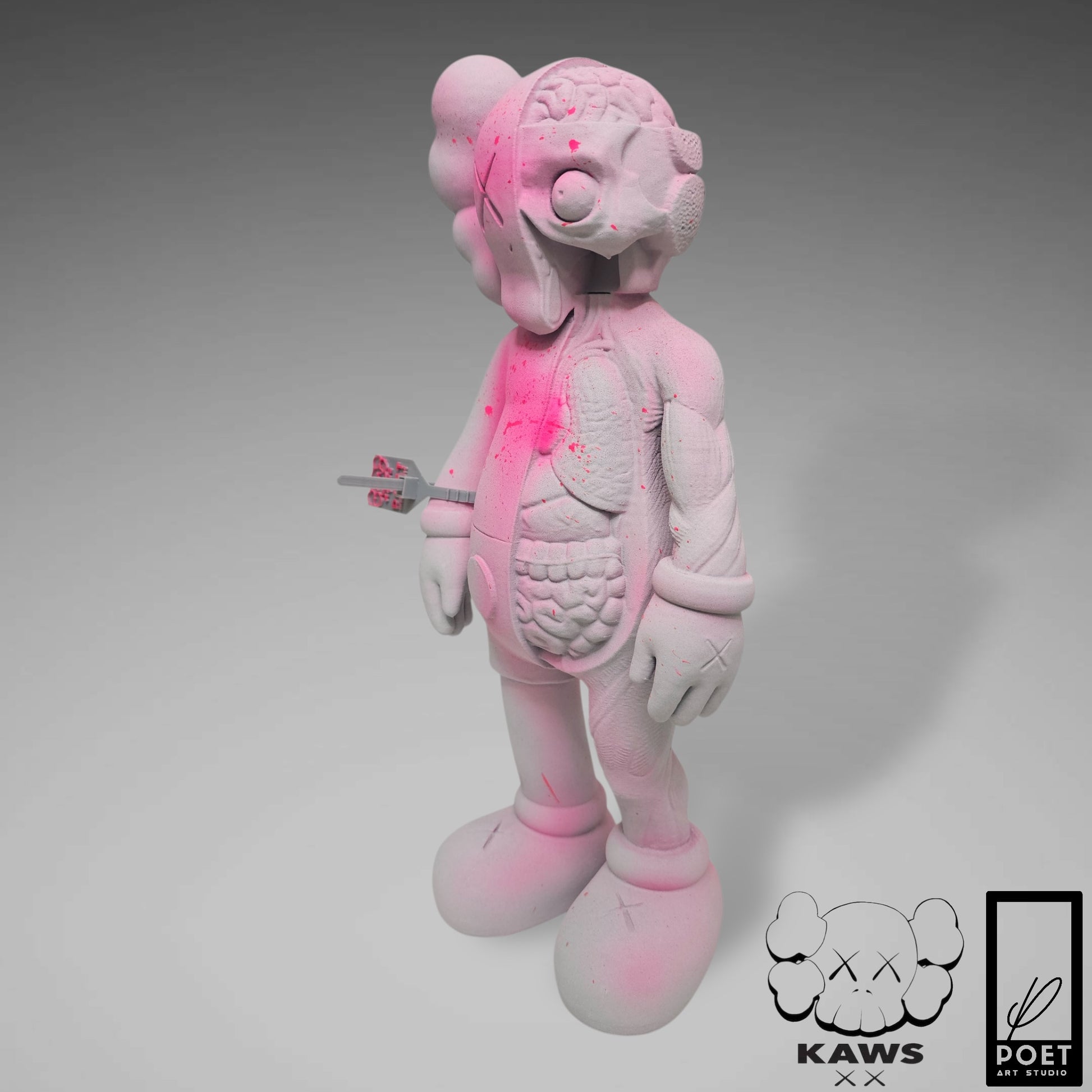 This modern Kaws street art piece, inspired by the vibrant neon color of betonovy street art, showcases a unique contrast with the use of pink neon. Add an edgy touch to any space with this flayed open design by Poet.