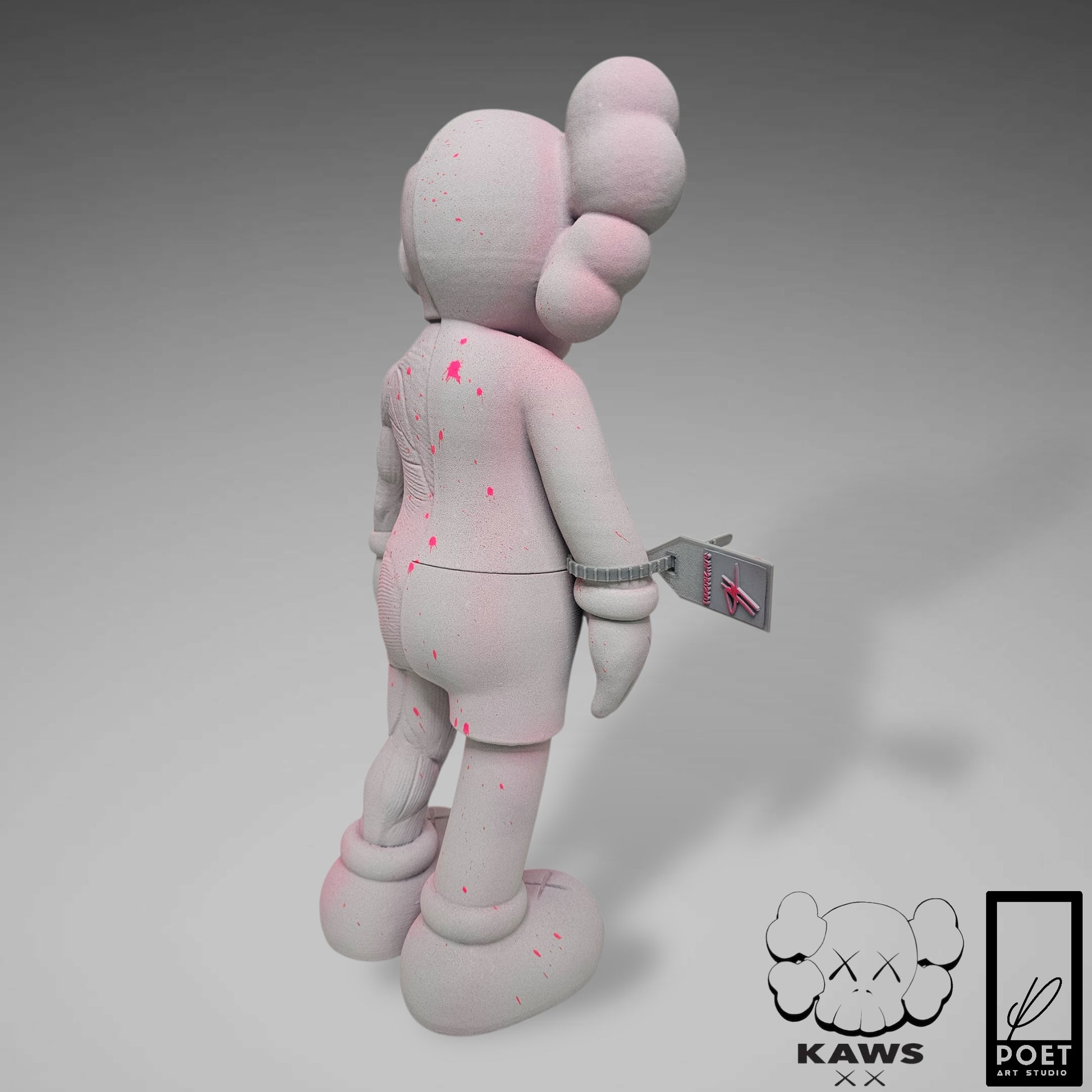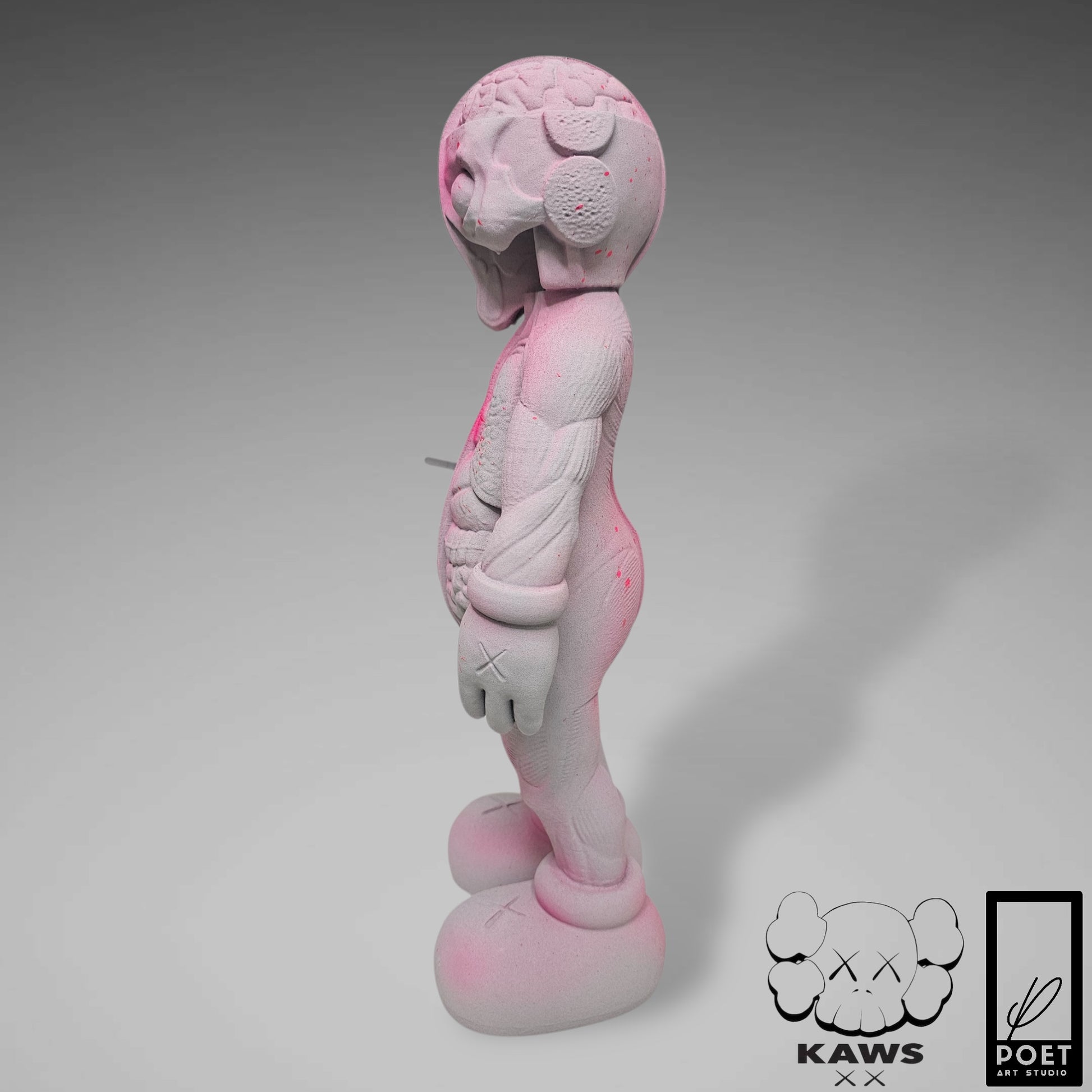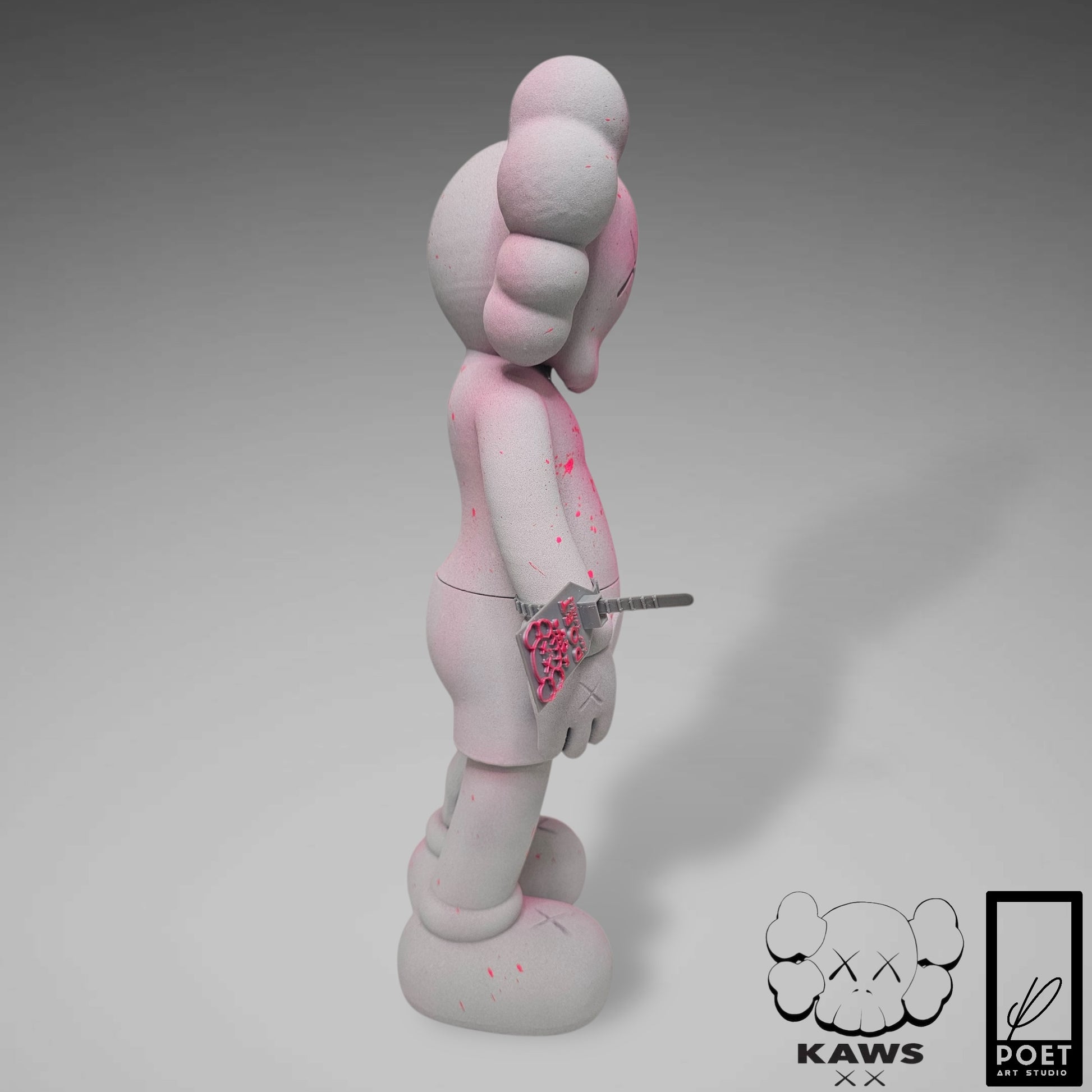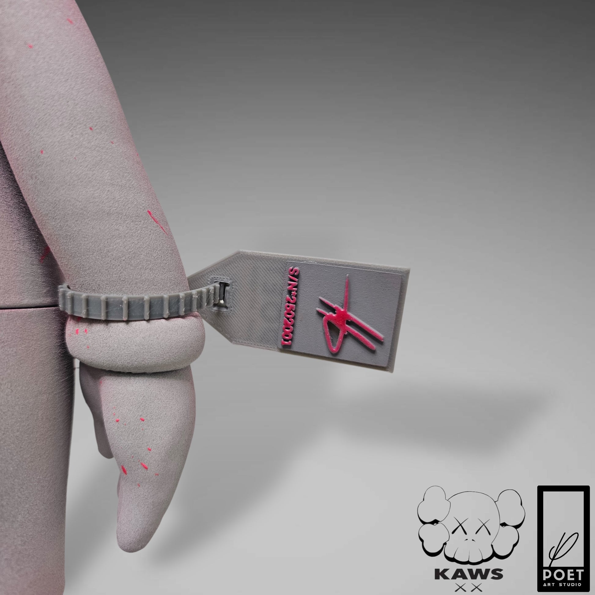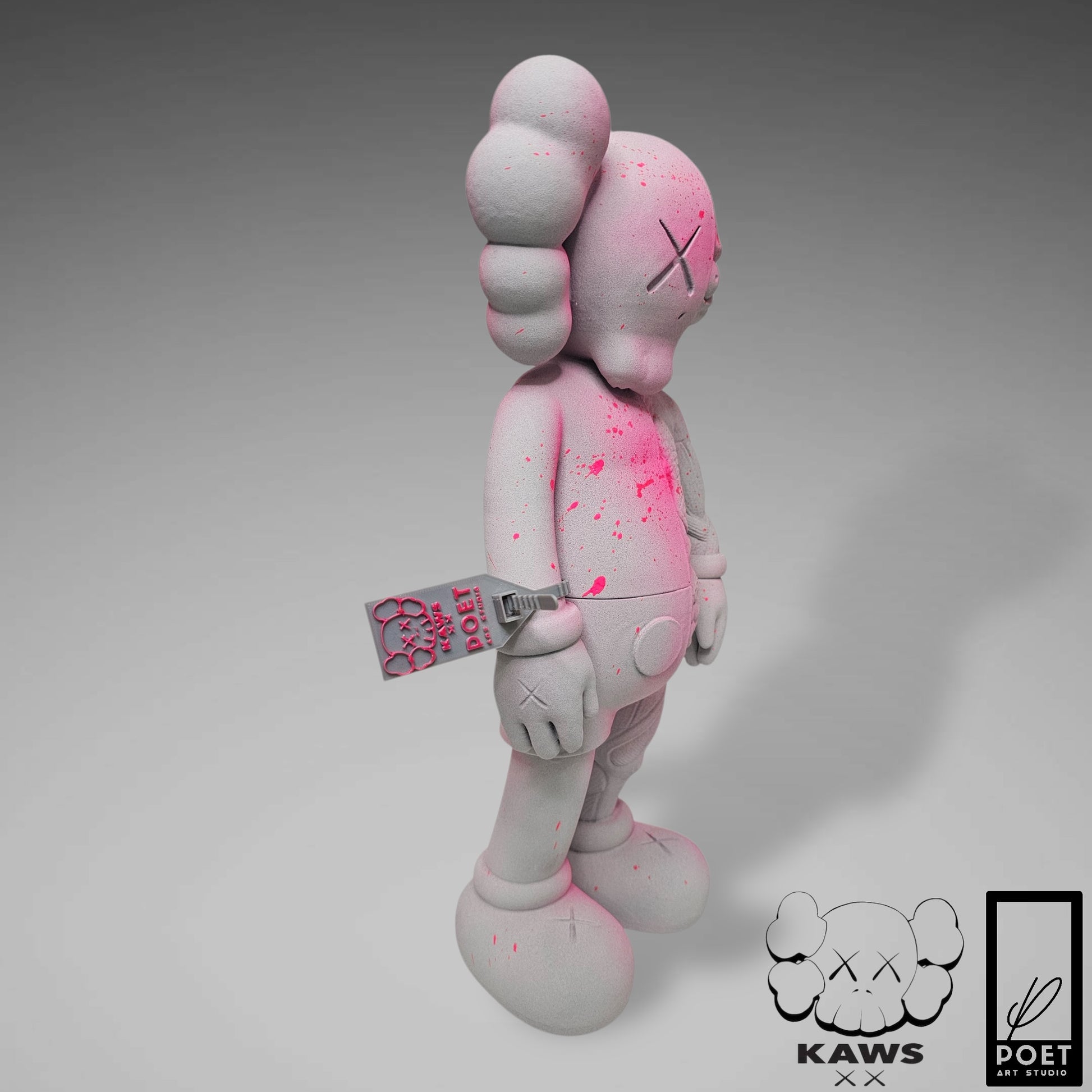 This modern Kaws street art piece, inspired by the vibrant neon color of betonovy street art, showcases a unique contrast with the use of pink neon. Add an edgy touch to any space with this flayed open design by Poet.